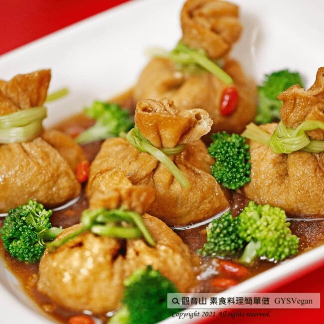 吉祥福袋是一道手作菜,小巧精緻非常喜氣! 主廚將多種食材切細、炒香、調味料理後,包入福袋豆皮中,外表就象古時候…